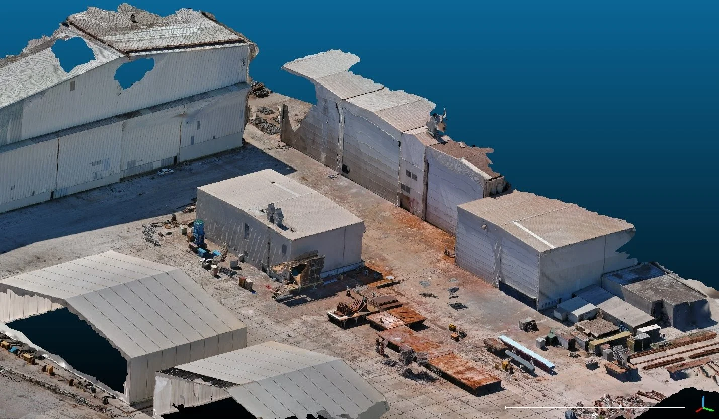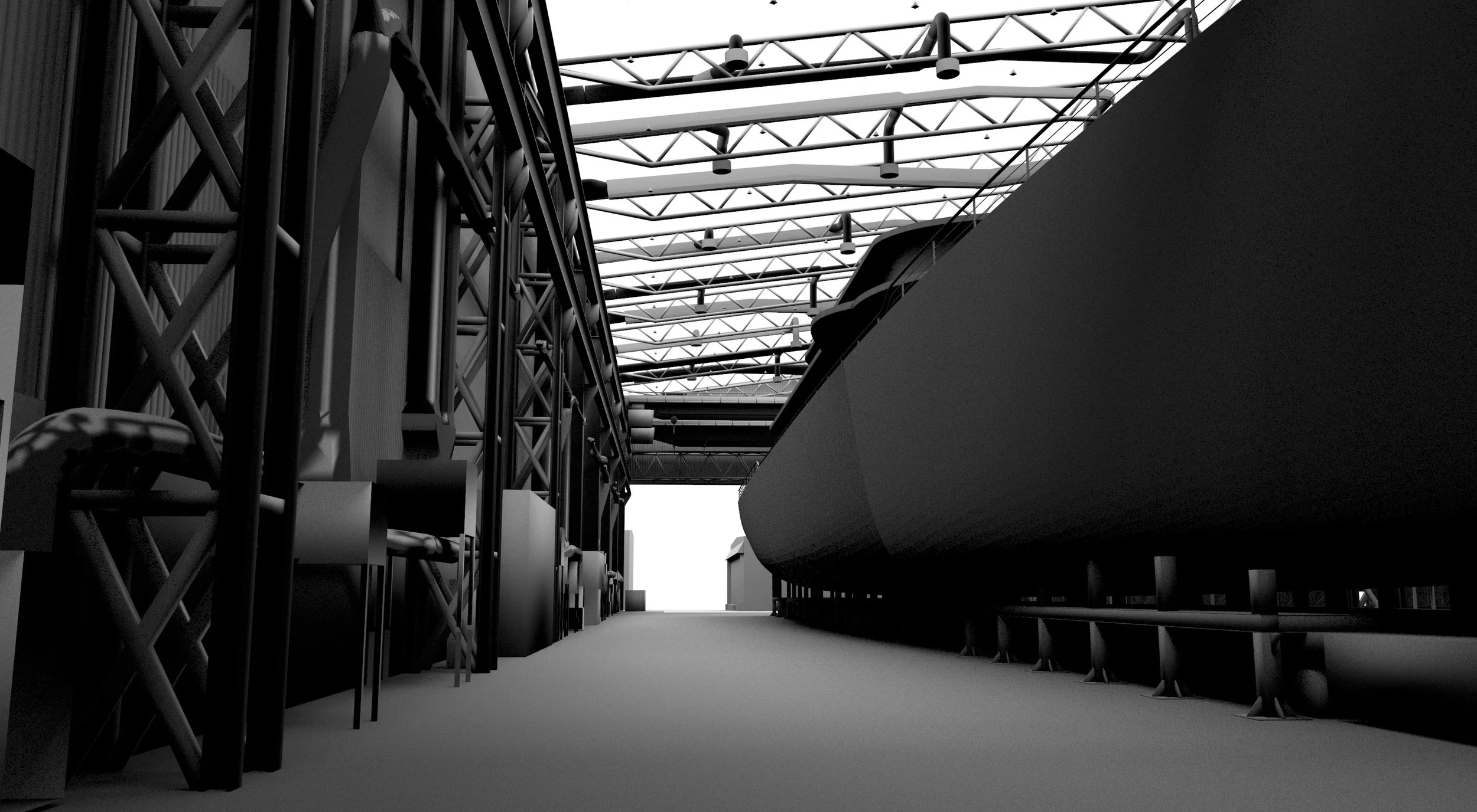 3d scanning of exterior and interior(drone photogrammetry and laser), 3d reconstruction, merging with ship 3d model, simulation of available assembly and launching scenarios